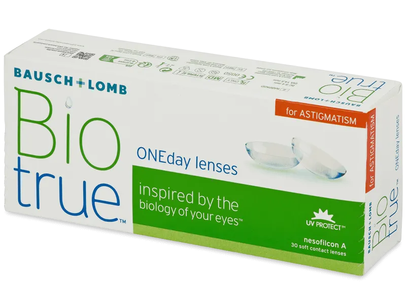 Biotrue ONEday контактни лещи за астигматизъм са торични лещи на известният производител Bausch and Lomb. Произведени са от технологично усъвършенствания материал HyperGel (Nesofilcon A), за да се осигури високо съдържание на вода и кислородна пропускливост. Тези лещи осигуряват изключителен комфорт и ефективност през целия ден.Високото съдържание на вода = по-удобна употреба